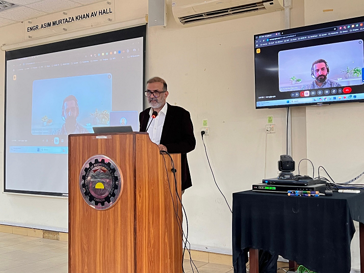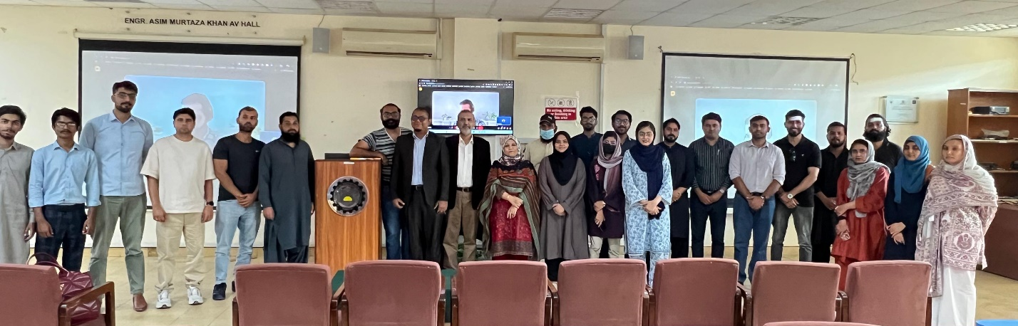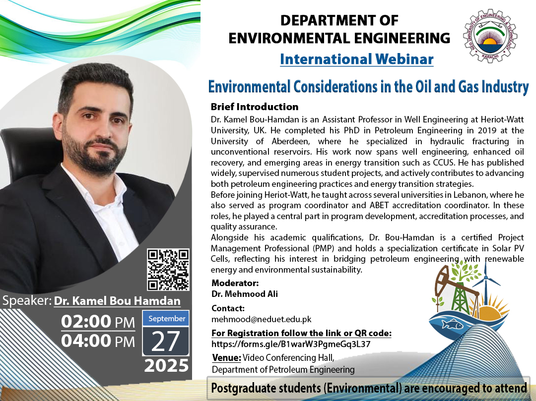 The Department of Environmental Engineering, NED University of Engineering and Technology organized an international webinar on ‘Environmental Considerations in the Oil and Gas Industry’ for the postgraduate students enrolled in the Environmental Engineering and Environmental Management programs on September 27, 2025 at the Seminar Hall of the Department of Petroleum Engineering, NED University.  The distinguished guest speaker for the session was Dr. Kamel Bou Hamdan, an Assistant Professor, in the School of Energy, Geoscience, Infrastructure and Society, Institute for Geo-Energy Engineering at Heriot-Watt University, Scotland, UK. The event was moderated by Dr. Mehmood Ali, Associate Professor in the Department of Environmental Engineering, NED University. The guest speaker shared information about environmental pollution caused by petroleum oil and gas industry, its impact on the health of humans and the pollution control innovative green technologies.  The session concluded with a vote of thanks to the guest speaker by Dr. Mehmood Ali and Dr. Abdul Ghaffar.