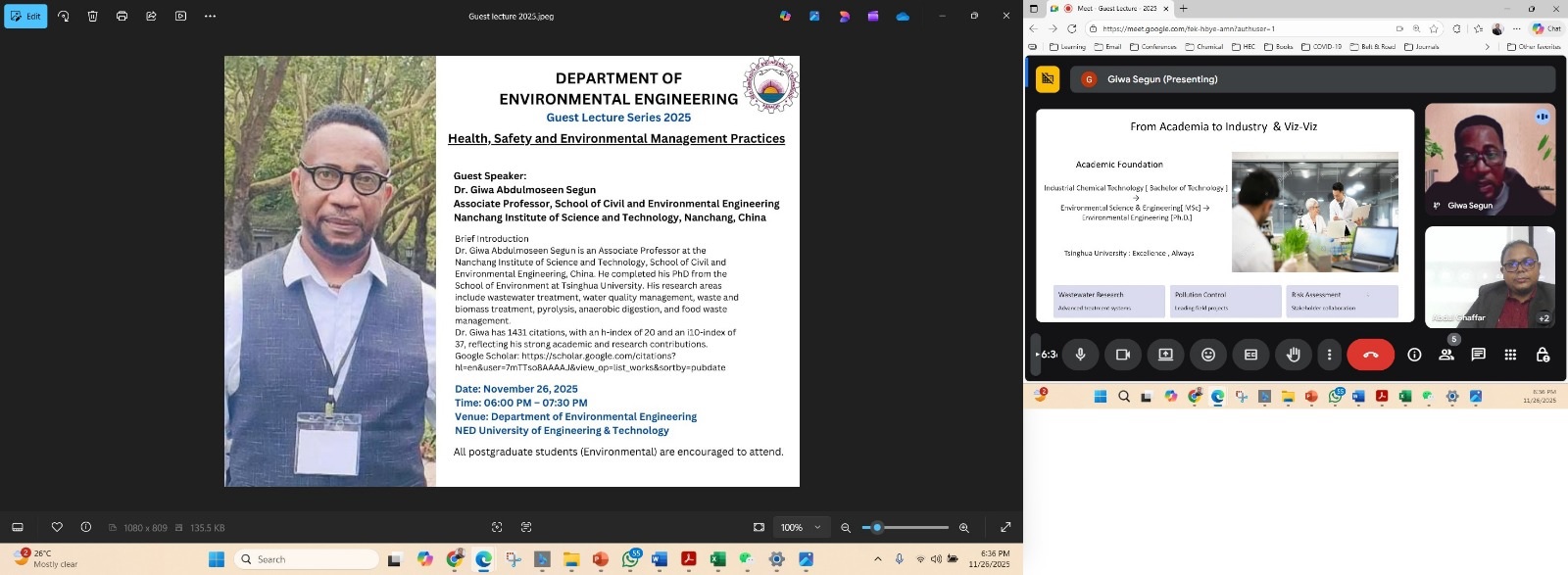 Dr. Abdulmoseen Segun Giwa, an international guest speaker is Associate Professor, Lead Scientist, and Lead Environmental Specialist at School of Civil and Environmental Engineering, Nanchang Institute of Science and Technology, Nanchang, China. The speaker discussed global health safety and environmental management practices in R&D institutes and industries, shared insights on global career paths, future trends and forthcoming academic and research opportunities highlighting shifting international, industry trends. Participants had learned insights and interactive discussion with speaker. The session was moderated by Dr. Abdul Ghaffar, Professor in the department.