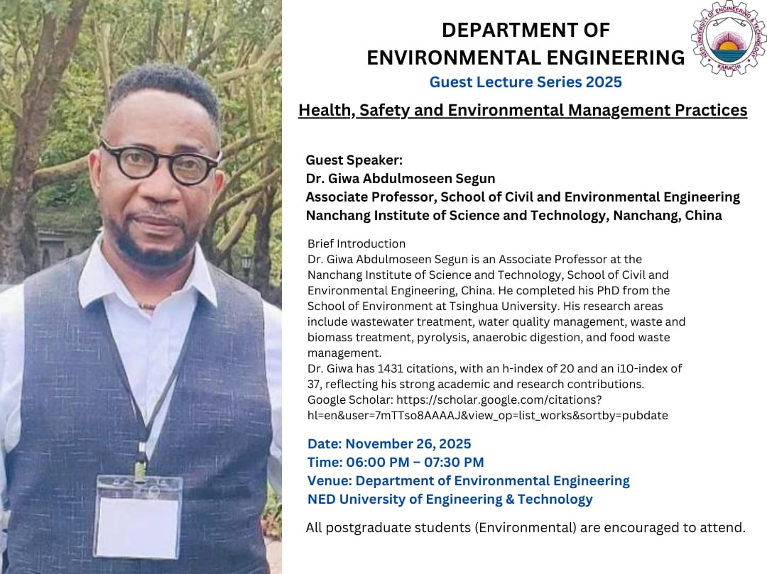 The Department of Environmental Engineering, NED University of Engineering & Technology organized a guest lecture on Health Safety and Environmental Management Practices for the postgraduate students enrolled in the Environmental Engineering and Environmental Management programs. The lecture took place on November 27th, 2025.